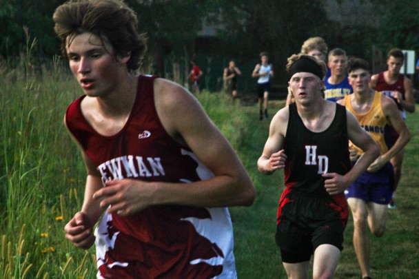 Jack Showalter of the Bulldogs, second from front, worked his way to a top-10 finish in his first cross country race ever. He led the Bulldogs to a sixth-place team finish out of eight squads. (Kristi Nixon/Hampton Chronicle)