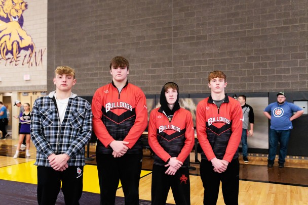 The four Bulldog state qualifiers from left to right 182 Cael Burmester, 285 Carter Heilskov, 106 Jayson Stevens, and 132 Charlie Showalter.