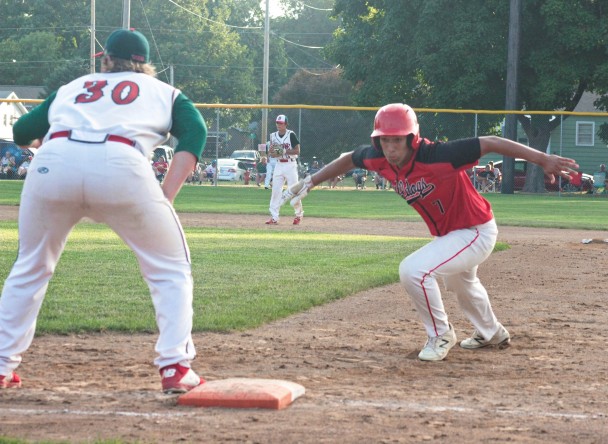 Mario De La Cruz of the Bulldogs turns to dive back into first base on a pick-off attempt by Boone's Morgan Smith in this Class 3A district game on Friday, July 17. (Kristi Nixon/Hampton Chronicle)