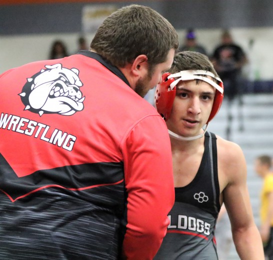 Bulldog head wrestling coach Patrick Hansen, left, discusses strategy with 120-pounder Jakyb Kapp before he starts his semifinal match on Saturday during the Doug Wood Invitational. (Tyler Anderson/Mid-America Publishing)