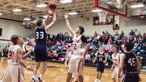 AGWSR's Luke Starr (33) puts up a shot over the oustretched arm of Bulldog post Drew Uhlenhopp on Tuesday, Dec. 3. (Kristi Nixon/Hampton Chronicle)