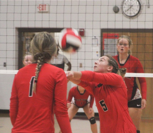 Bulldog setter Aja Sheppard bump-sets the ball in front of teammate Kortney Dunt during the 3-0 sweep of the Warhawks last week. (Kristi Nixon/Hampton Chronicle)