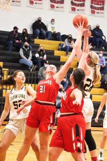 Bulldog junior Avery Hanson goes for a rebound amidst traffic at Clear Lake High School on Friday, Dec. 18. (Kristi Nixon/Hampton Chronicle)