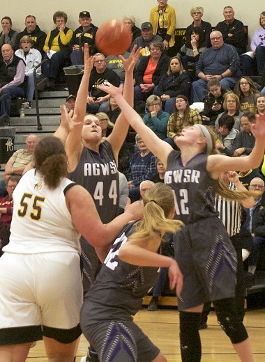 AGWSR's Grace Finger (44) and Alyssa Hames (12) reaches for the basketball on a rebound as teammate Morgan Bakker (42) blocks out Garrigan's Audi Crooks (55) during regional semi-final cage play Friday. The Cougars lost, 63-41 and ended the season 18-6. (Scott Bierle, Mid-America Publishing)