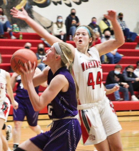 Class 1A and 2A all-district girls' basketball players AGWSR's Alyssa Hames, left, and West Fork's Emma Martinek are shown in this non-conference game this season. (File photo)