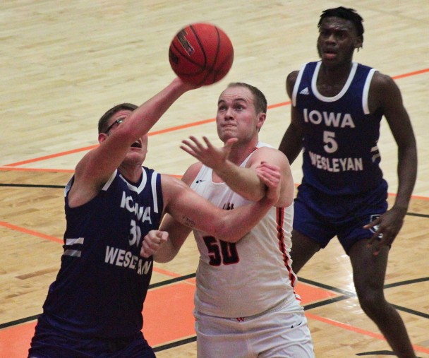 West Fork graduate Jacob Kuhlemeier (50) fights for an offensive rebound against Iowa Wesleyan on Friday, Nov. 15 at Waverly. Kuhlemeier had a solid all-around game in the win. (Kristi Nixon/Hampton Chronicle)