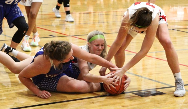 West Fork's Maddie Hubka, middle, and Madisyn Bonner, right, fight for the basketball with a Northwood-Kensett player in the first half of the Warhawks' 48-22 win last week. (Kristi Nixon/Hampton Chronicle)