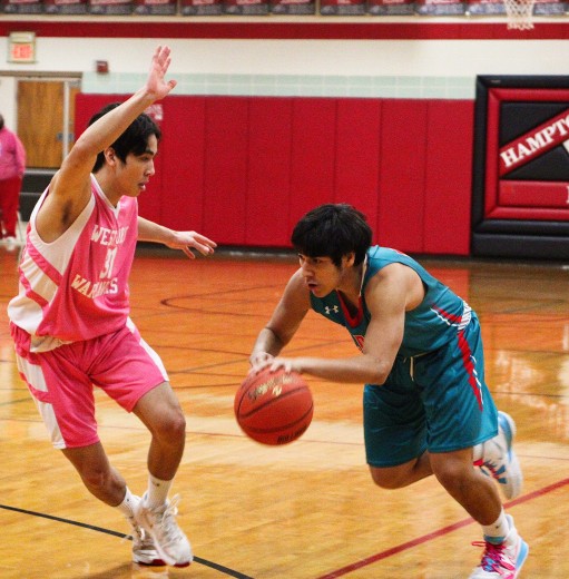 Bulldog senior Mario De La Cruz drives around West Fork's Ren Heimer in the first half of the Coaches vs. Cancer game on Saturday, Jan. 23. (Kristi Nixon/Hampton Chronicle)