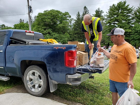 Volunteers load canned and boxed food goods collected at the gate of the Geneva Market. Shoppers were asked to bring one item to benefit local pantries. SUBMITTED PHOTO