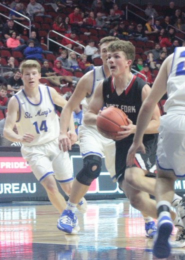 Kayden Ames of West Fork drives into the lane during the Class 1A state basketball tournament last week. Ames was voted to second team all-state by the Iowa Print Sports Writers Association, announced this morning. (Kristi Nixon/Hampton Chronicle)