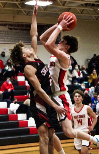 Bulldog senior Jordan Severs is heavily defended as he goes up for a shot against Clarion-Goldfield-Dows on Tuesday, Feb. 9. (Kristi Nixon/Hampton Chronicle)