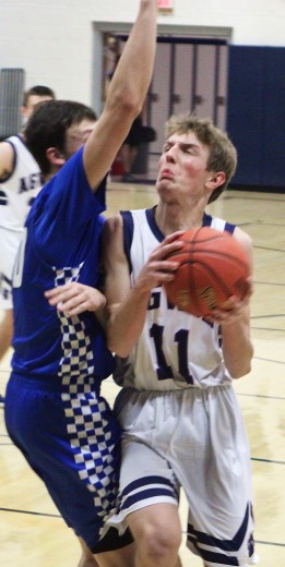Daniel Stahl of AGWSR is fouled as he goes toward the basket on Friday, Jan. 8. The Cougars made it close, but fell to G-R, 42-37. (Kristi Nixon/Hampton Chronicle)