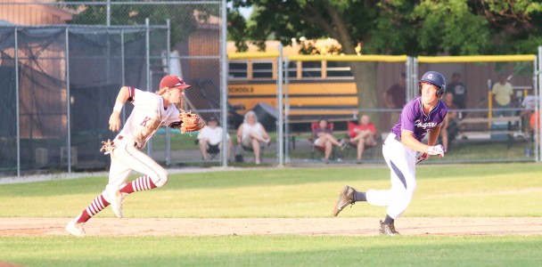 Mason City Newman shortstop Tim Castle chases down AGWSR's Jaden Penning after he tried to turn a double into a triple during the fourth inning of the Class 1A District final at Mason City on Saturday, July 18. (Chris Barragy/Mid-America Publishing)