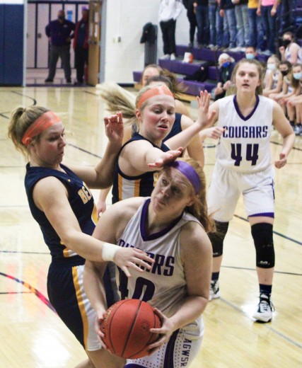 AGWSR's MaKenna Kuper is heavily defended underneath the basket by North Butler's Sydney Eiklenborg, left, and Haylee Niemann. (Kristi Nixon/Mid-America Publishing)
