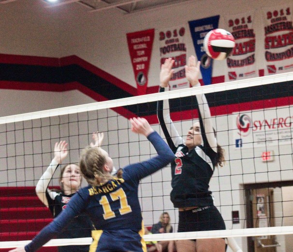 West Fork senior Nashaun Bryant’s block attempt goes out of bounds off of the kill attempt by North Butler’s Cassidy Staudt (17) on Tuesday, Oct. 1. (Kristi Nixon/Hampton Chronicle)