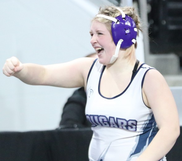 AGWSR wrestler Rory Siems reacts after winning a match in the IWCOA girls' state wrestling tournament last weekend in Coralville. (Tyler Anderson/Mid-America Publishing)
