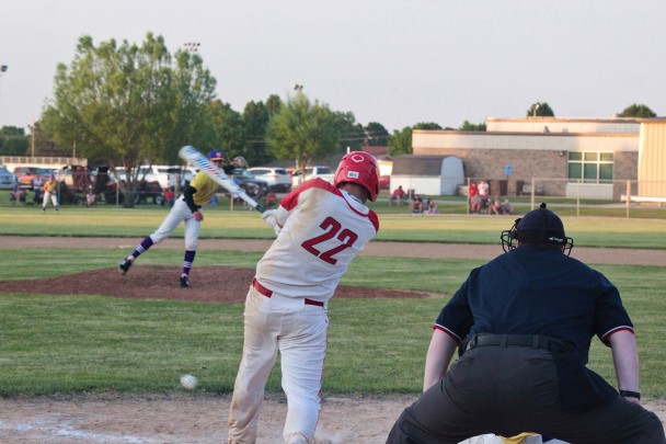Drew Uhlenhopp swings away in the Bulldogs' conference game against Webster City. Uhlenhopp repeated as a North Central Conference first team selection, announced last week. (File photo)