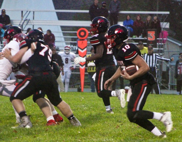 West Fork quarterback Kayden Ames (10) reads the defense while getting key blocking from Cannon Craighton (79) on Friday, Sept. 11. (Kristi Nixon/Hampton Chronicle)
