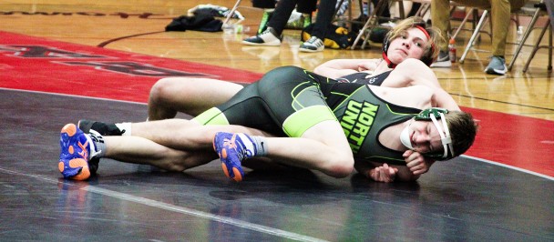 West Fork 170-pounder Dakota Lau turns North Union's Kale Lufkin on the way to a win by fall on Tuesday, Jan. 26. (Kristi Nixon/Hampton Chronicle)
